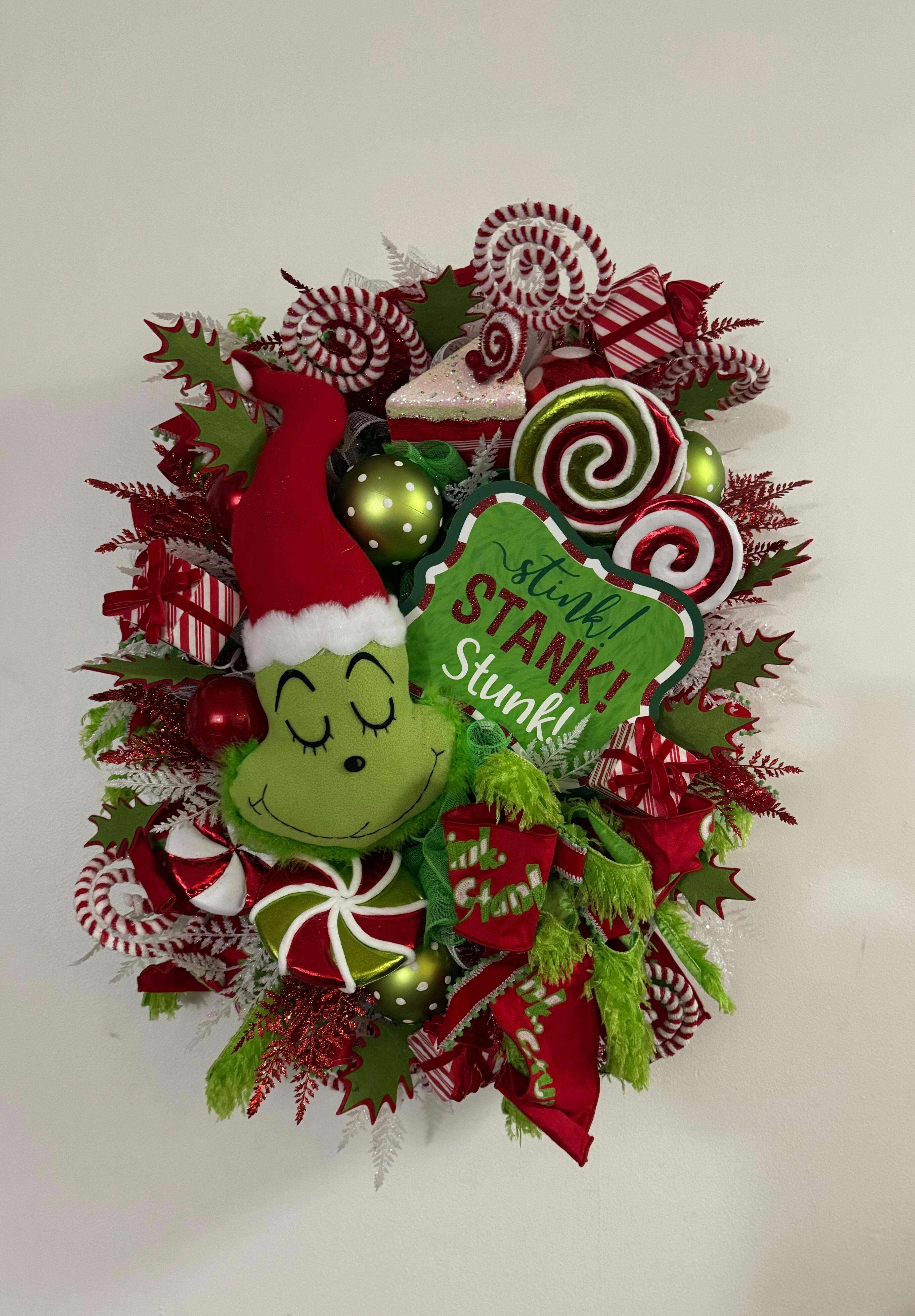 Jennifer Manoj I am in love with this Christmas Grinch wreath! The quality and detail are even better in person. The colors are bright and festive, and the mix of candy-inspired decorations, ribbons, and greenery gives it a fun, whimsical look.